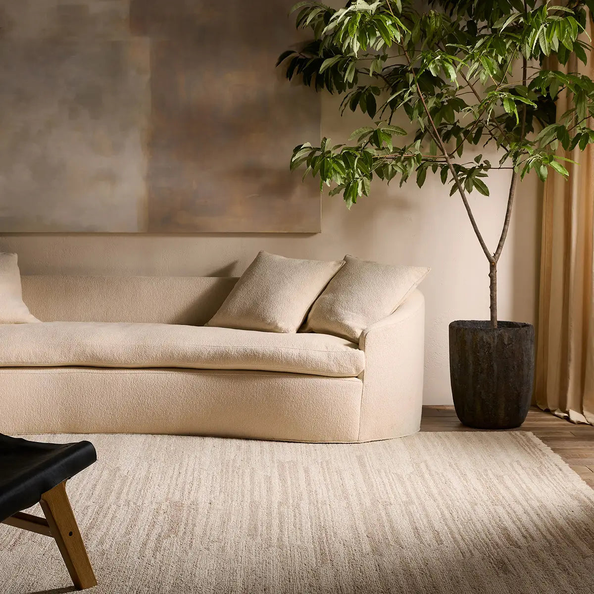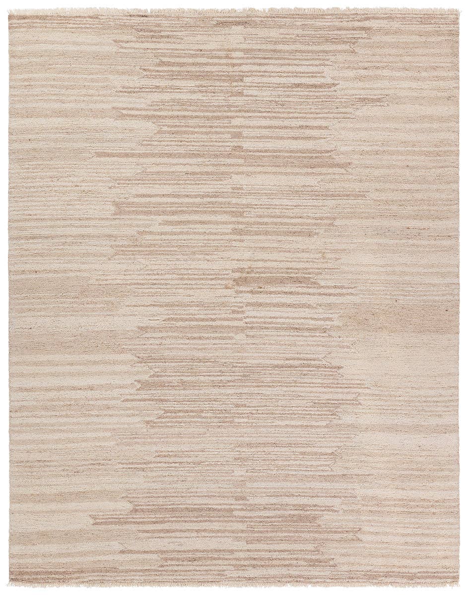This hand-tufted rug is inspired by modern Moroccan patterns and neutral colorways and features a striated tan and cream background, with a center column of darker brown accents. Short, cream fringe and 100% wool pile adds to the global appeal. This rug is naturally stain-resistant and works best in low traffic areas of the home such as bedrooms, formal living rooms, formal dining rooms, and sitting rooms.