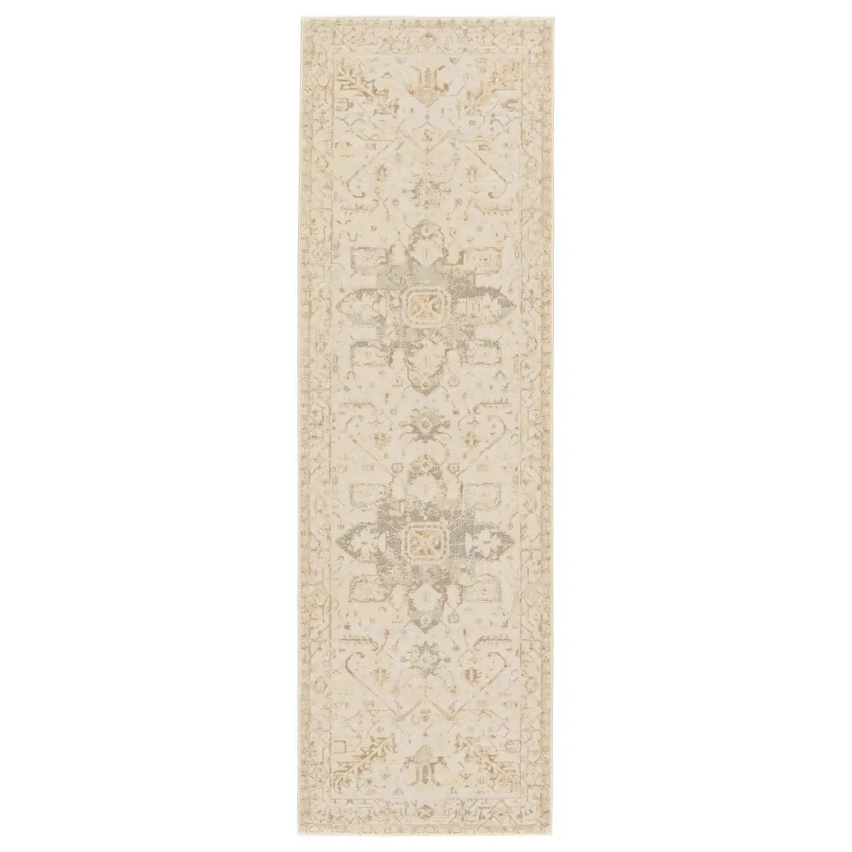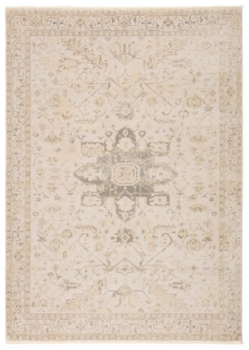 This elegant rug showcases the on-trend blanc de blanc look for an effortless and luxuriously vintage statement, boasting a subtly distressed center medallion motif in light tones of cream, ivory, and light gray, with accents of metallic silver and gold. Soft and lustrous, this chameleon-like design emulates the timeless style of a Turkish hand-knotted rug, but in an accessible polyester and viscose power-loomed quality.